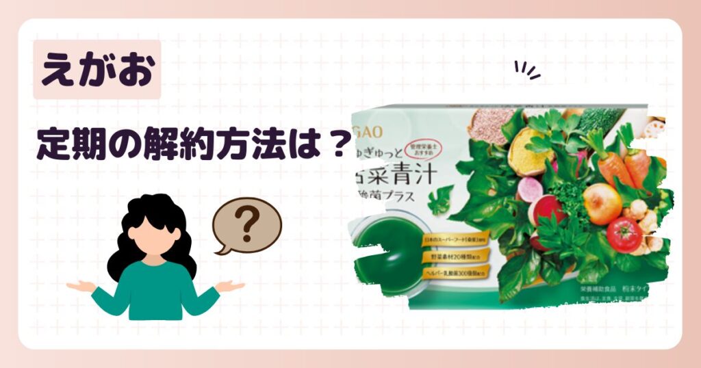 えがお定期便(=定期コース)の解約方法は2通りあります。 電話をして解約する マイページで解約する えがお定期便を解約したい場合、電話とマイページで解約することができます。 えがお定期便は次回お届け予定日の15日前まで解約できます。 どちらかの方法... -