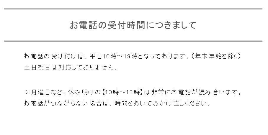 電話 | 〇 0120-707-773 営業時間:平日10:00~19:00 休業日:土日祝 |