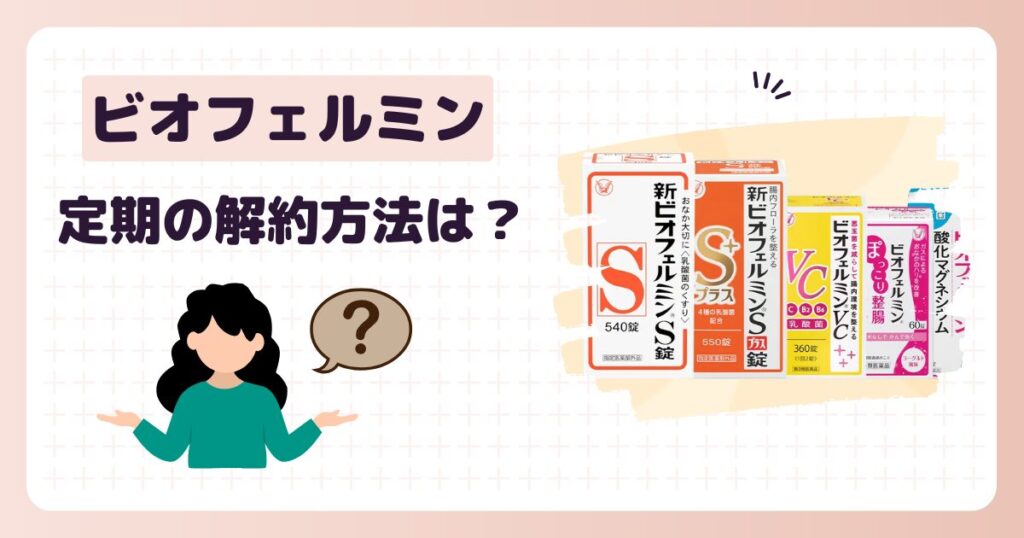ビオフェルミン定期便の解約方法は1通りあります。 電話をして解約する ビオフェルミン定期便を解約したい場合、電話で解約することができます。 ビオフェルミン定期便は次回お届けの10日前まで解約できます。 お肌へのトラブルを見逃さないように電話での... -