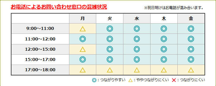 解約アドバイザー混みやすいのは休み明け、お昼、仕事終わりの時間帯なので、それを避けましょう。